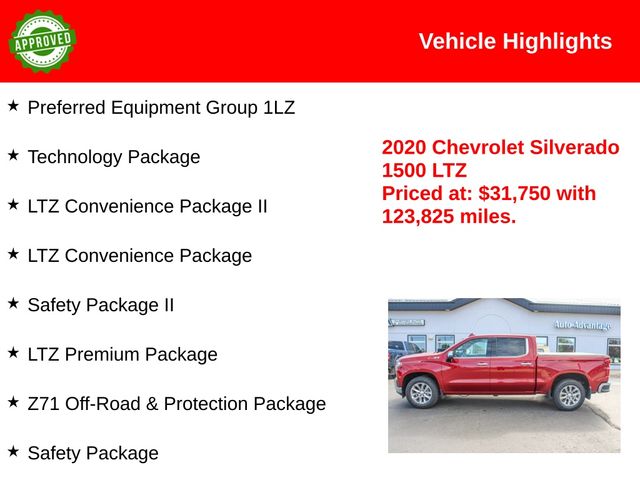 Discover the perfect blend of capability, comfort, and technology in the 2020 Chevrolet Silverado 1500 LTZ. Experience the confidence and command of the road that this exceptional truck can provide. Visit our showroom today and let us demonstrate how this Silverado can elevate your driving experience.