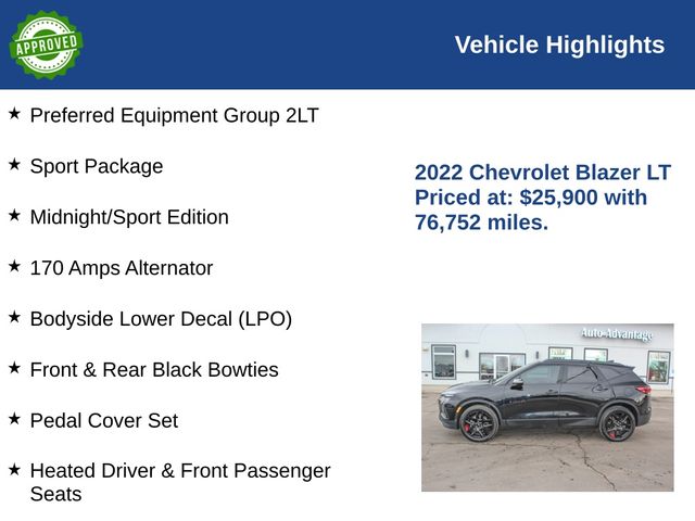 Boasting a striking Midnight/Sport Edition and a comprehensive Preferred Equipment Group 2LT, this Blazer LT is packed with an impressive array of features that cater to your every need. Highlights include: