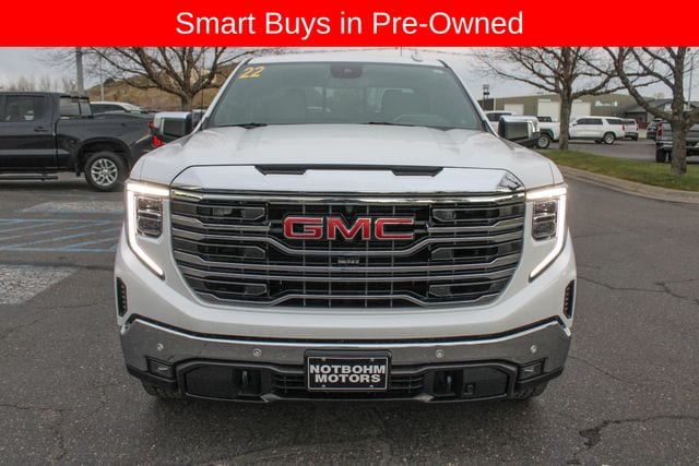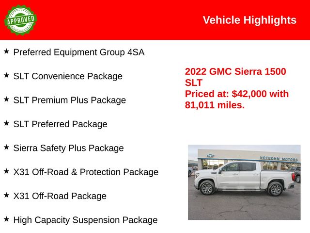 Elevate your driving experience with the advanced technology and luxurious appointments of this 2022 GMC Sierra 1500 SLT. The SLT Premium Plus Package adds a wealth of convenience and safety features, including the ProGrade Trailering System, Sierra Safety Plus Package, and 20-inch polished aluminum wheels. The X31 Off-Road and Protection Package further enhances the Sierra's capability, with off-road suspension, all-terrain tires, and a spray-on bedliner.