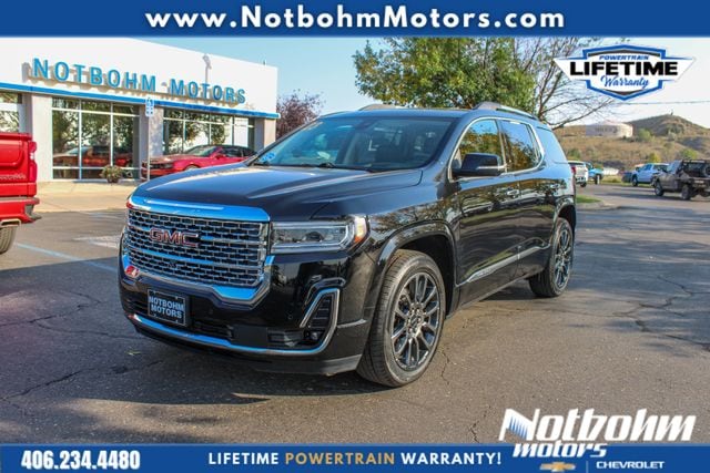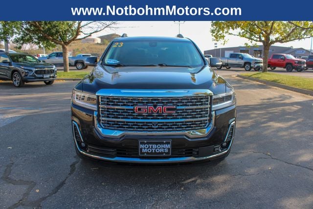 The 2023 GMC Acadia Denali is an all-wheel drive SUV with a 3.6L DOHC DI V6 engine and a 9-speed automatic transmission. It has a Jet Black interior and 6-passenger seating.