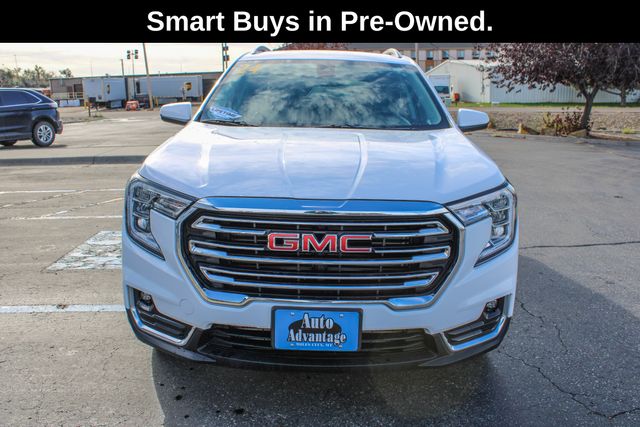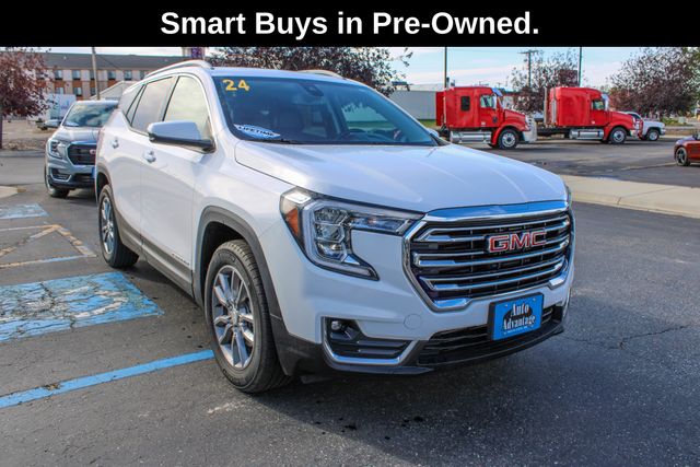 The 2024 GMC Terrain SLT AWD in Ebony Twilight Metallic is a compact SUV offering a blend of capability and premium features. It is powered by a 1.5L Turbo DOHC 4-Cylinder engine and a 9-Speed Automatic Transmission. It achieves an estimated fuel economy of 23 MPG city and 28 MPG highway (25 combined).