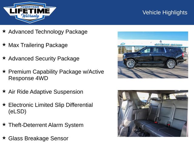 4WD, Advanced Security Package, Advanced Technology Package, Air Ride Adaptive Suspension, Electronic Limited Slip Differential (eLSD), Enhanced Automatic Parking Assist, Glass Breakage Sensor, Inside Rearview Auto-Dimming Rear Camera Mirror, Max Trailering Package, Premium Capability Package w/Active Response 4WD, Rear Camera Mirror Washer, Reverse Automatic Braking, Super Cruise, Theft-Deterrent Alarm System, Vehicle Inclination Sensor, Vehicle Interior Movement Sensor, 15" Diagonal Multi-Color Head-Up Display, 2 Presets For Outside Rearview Mirrors, 3.23 Rear Axle Ratio, 3rd Row 60/40 Power-Folding Split-Bench Seat, 3rd row seats: split-bench, 4-Wheel Disc Brakes, ABS brakes, Adaptive Cruise Control, Adaptive suspension, Air Conditioning, Alloy wheels, AM/FM radio: SiriusXM with 360L, AM/FM Stereo, Apple CarPlay/Android Auto, Auto High-beam Headlights, Auto-dimming door mirrors, Auto-dimming Rear-View mirror, Auto-leveling suspension, Automatic temperature control, Bodyside moldings, Brake assist, Bright Front & Rear Door Sill Plates, Bumpers: body-color, Chrome Door Handles w/Body-Color Strip, Compass, Delay-off headlights, Driver door bin, Driver vanity mirror, Dual Exhaust System, Dual front impact airbags, Dual front side impact airbags, Dual-Pane Panoramic Power Sunroof, Electronic Stability Control, Emergency communication system: OnStar and GMC connected services capable, Enhanced Automatic Emergency Braking, Extra Capacity Cooling System, Floor Console, Four wheel independent suspension, Front anti-roll bar, Front Bucket Seats, Front Center Armrest, Front dual zone A/C, Front fog lights, Front reading lights, Fully automatic headlights, Garage door transmitter, Hands-Free Power Programmable Rear Liftgate, HD Surround Vision, Heads-Up Display, Heated 2nd Row Outboard Position Seats, Heated door mirrors, Heated Driver & Front Passenger Seats, Heated front seats, Heated rear seats, Heated Steering Wheel, Heated steering wheel, Hill Descent Control, Hitch View, Illuminated entry, Integrated Trailer Brake Controller, Low tire pressure warning, Magnetic Ride Control Suspension, Memory seat, Navigation System, Occupant sensing airbag, Outside Heated Power-Adjustable Mirrors, Outside temperature display, Overhead airbag, Overhead console, Panic alarm, Passenger door bin, Passenger vanity mirror, Perforated Heated & Ventilated Dr & Frt Pass Seats, Power door mirrors, Power driver seat, Power Liftgate, Power passenger seat, Power Release 2nd Row Bucket Seats, Power steering, Power Tilt & Telescopic Steering Column, Power windows, Power-Retractable Assist Steps, Rain sensing wipers, Rear air conditioning, Rear anti-roll bar, Rear Cross Traffic Alert, Rear Pedestrian Alert, Rear reading lights, Rear Seat Media System, Rear window defroster, Rear window wiper, Remote keyless entry, Roof rack: rails only, Safety Alert Seat, Security system, SiriusXM w/360L, Smart Trailer Integration Indicator, Speed control, Speed-sensing steering, Split folding rear seat, Spoiler, Sport Pedal Cover Kit (LPO), Steering wheel memory, Steering wheel mounted audio controls, Tachometer, Telescoping steering wheel, Tilt steering wheel, Traction control, Trailer Side Blind Zone Alert, Trip computer, Turn signal indicator mirrors, Universal Home Remote, Variably intermittent wipers, Ventilated front seats, Voltmeter, Wireless Charging, 4WD, Advanced Security Package, Advanced Technology Package, Air Ride Adaptive Suspension, Electronic Limited Slip Differential (eLSD), Enhanced Automatic Parking Assist, Glass Breakage Sensor, Inside Rearview Auto-Dimming Rear Camera Mirror, Max Trailering Package, Premium Capability Package w/Active Response 4WD, Rear Camera Mirror Washer, Reverse Automatic Braking, Super Cruise, Theft-Deterrent Alarm System, Vehicle Inclination Sensor, Vehicle Interior Movement Sensor.